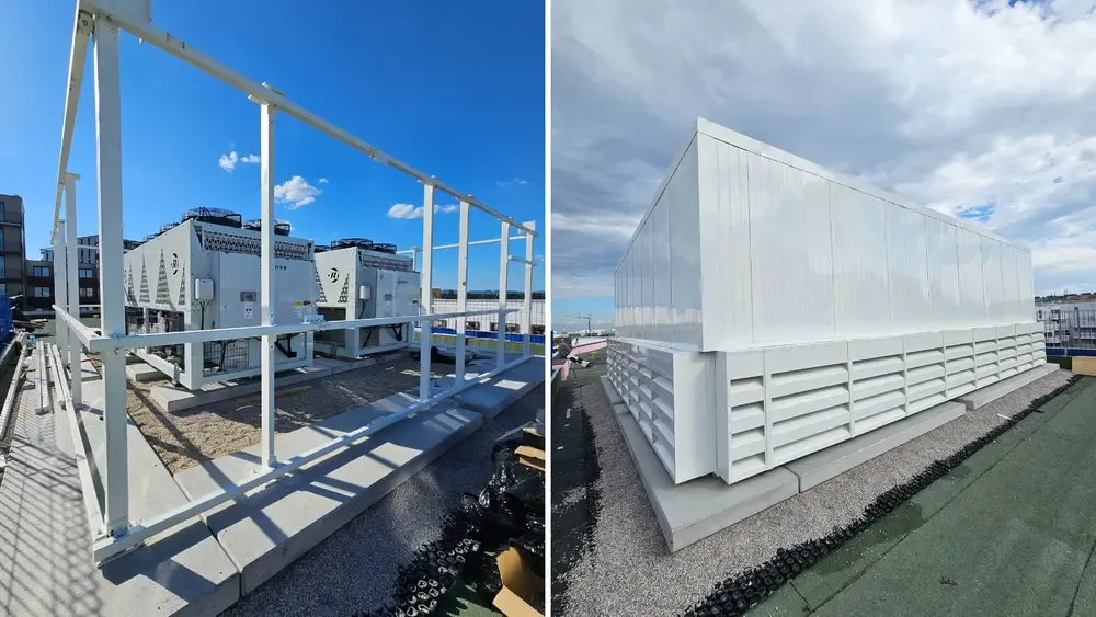 Именно с этой проблемой столкнулись в Fabrik1230: механическое сердце здания, два больших чиллера THEATU 4450 с воздушным охлаждением, пришлось установить на крыше, чтобы сохранить внутреннее пространство и соответствовать требованиям устойчивого развития. Однако это решение было сопряжено с риском передачи механического гула и резонанса вентиляторов в соседние офисы и жилые помещения. Для проекта, который гордился превосходным дизайном и комфортом жильцов, такой шум поставил бы под угрозу всю концепцию.