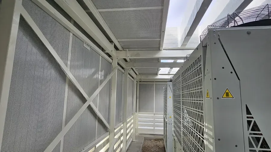 - Вытяжные шумоглушители глубиной 600 мм каждый оснащены разделительными элементами, заполненными минеральной ватой плотностью 45 кг/м³ и заключенными в перфорированную оцинкованную сталь для защиты от воздействия наружных условий. Они поглощают низкочастотные излучения, создаваемые осевыми вентиляторами чиллеров.
